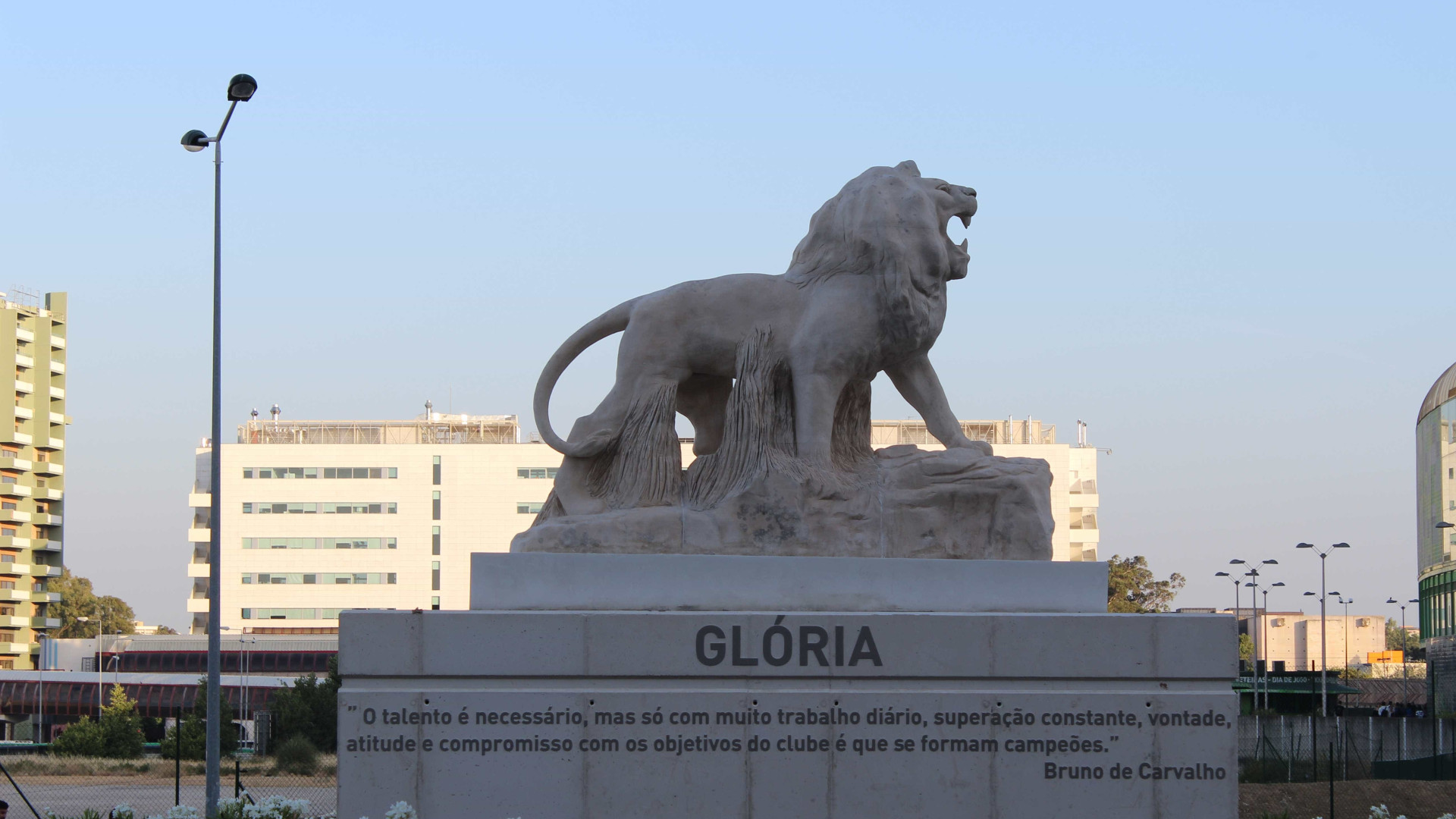 A estátua de um leão a rugir colocada em 2017 na nova rotunda entre o Estádio Alvalade XXI e o Pavilhão João Rocha ergue-se sobre um pedestal com quatro faces, alusivas ao lema do SCP (“Esforço, dedicação, devoção e glória”) e preenchidas pelo emblema do clube e por duas frases. A primeira destas foi proferida por um dos fundadores do Sporting, José Alvalade, enquanto a segunda, gravada na face relativa à “Glória”, pertence a Bruno de Carvalho, o presidente leonino responsável pela inauguração da obra. Se a escultura permanecer intacta daqui a 30 anos, nessa altura o nome de Bruno e a sua (banal) frase continuarão imortalizados no monumento. Esta situação dá a entender três coisas. Primeiro, uma confusão bizarra entre a instituição Sporting Clube de Portugal e o indivíduo que a preside, o qual já se serviu de meios do clube para divulgar notícias da sua vida pessoal. Segundo, a afirmação implícita de que Alvalade e Carvalho, separados por um século, são as duas principais figuras da história da colectividade lisboeta. Por fim, um prenúncio desagradável para os “leões”: enquanto José Alvalade simboliza o início do Sporting, Bruno de Carvalho pode ser o protagonista do fim do clube.